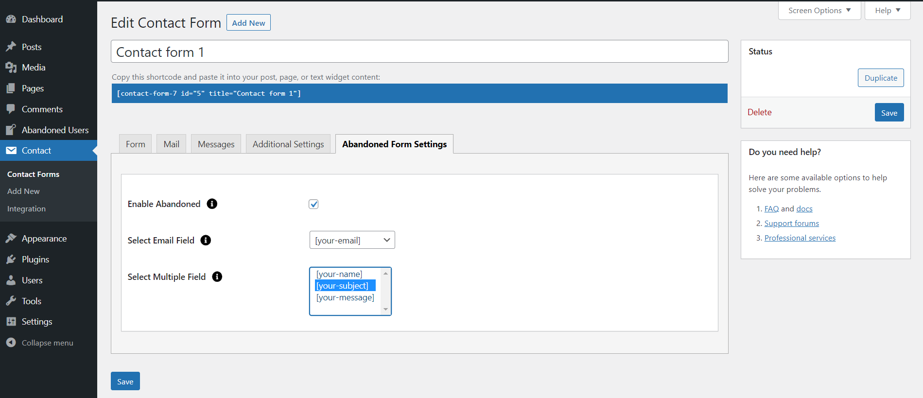 ‘Abandoned Contact Form 7 Pro’ plugin enables the user to select your email ID field for Form in the form settings. It offers the ability to enable/disable options for multiple forms as needed in Contact Form 7 and view the list of entries, IP addresses, and other data on the Admin side for Abandoned submission. The ‘Abandoned Contact Form 7 Pro’ plugin allows you to access the data filled up by the user and offers an option to customize the mail body for the Abandoned email.