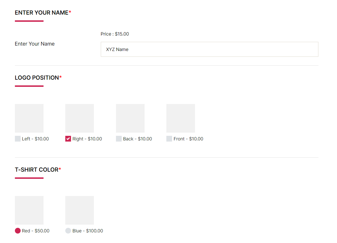 ‘Custom Product Options WooCommerce Pro’ plugin enables you to create multiple options for products based on specific customer needs. This plugin helps you create product options using the field types such as text field, text area, radio buttons, select box, multi-select box, checkbox, file upload, color swatch, text swatch, and more.