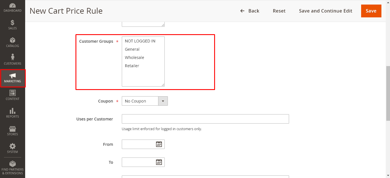 - The extension extends the default cart price rules configuration. So after installing the extension, edit the cart price rule, the store owner should go to MARKETING ⟶ Promotions ⟶ Cart Price Rules.
