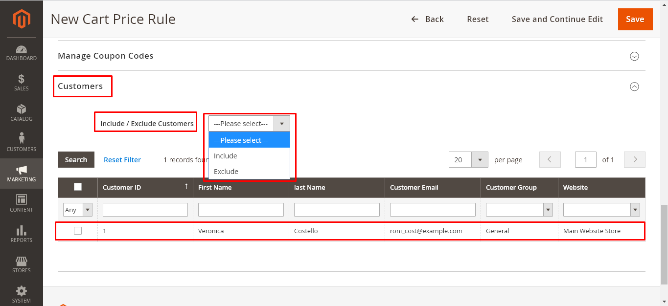 - This tab shows the customers grid based on selected customer groups with the default possibility to sort out the values and reset the filters. The customer grid supports the multi select possibility to choose several customers simultaneously. Once the customer(-s) are selected and the configuration is saved, the cart price rule will be triggered only for the targeted shopper(-s).