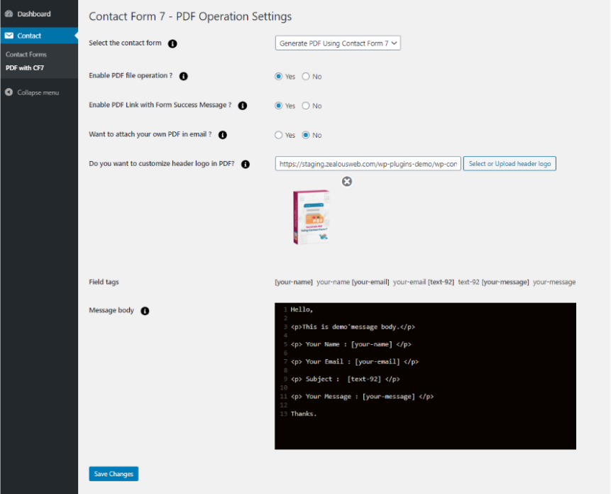 ZealousWeb 'Generate PDF using Contact Form 7 Pro' plugin for WordPress facilitates an easier way to download PDF documents and open the PDF document file after the successful form submission. The 'Generate PDF using Contact Form 7 Pro' plugin allows the user to set the document file as PDF from the 'Form Setting' Page of each Contact form.