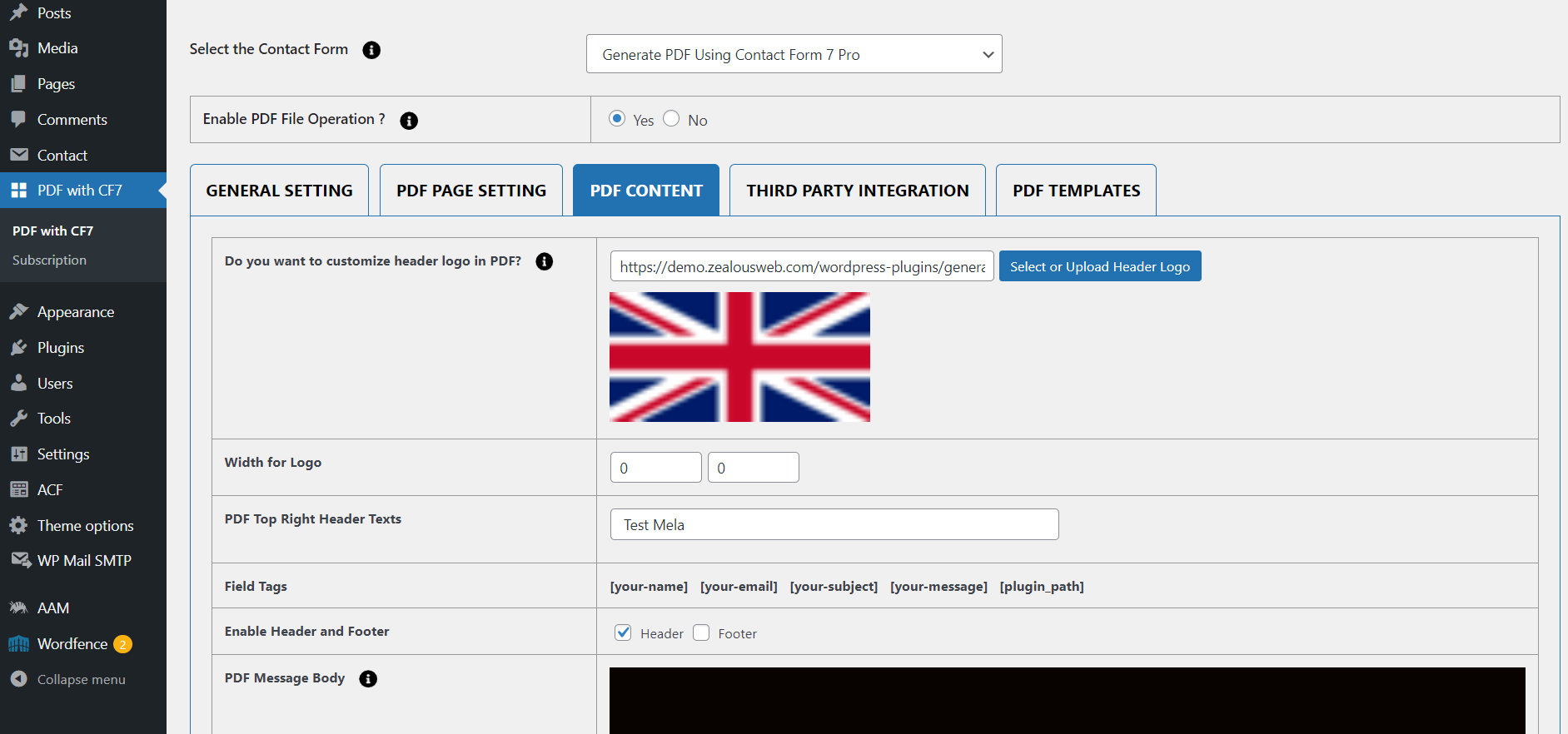 - Support all special Mail Tags in PDF that already support in contact form 7 mails