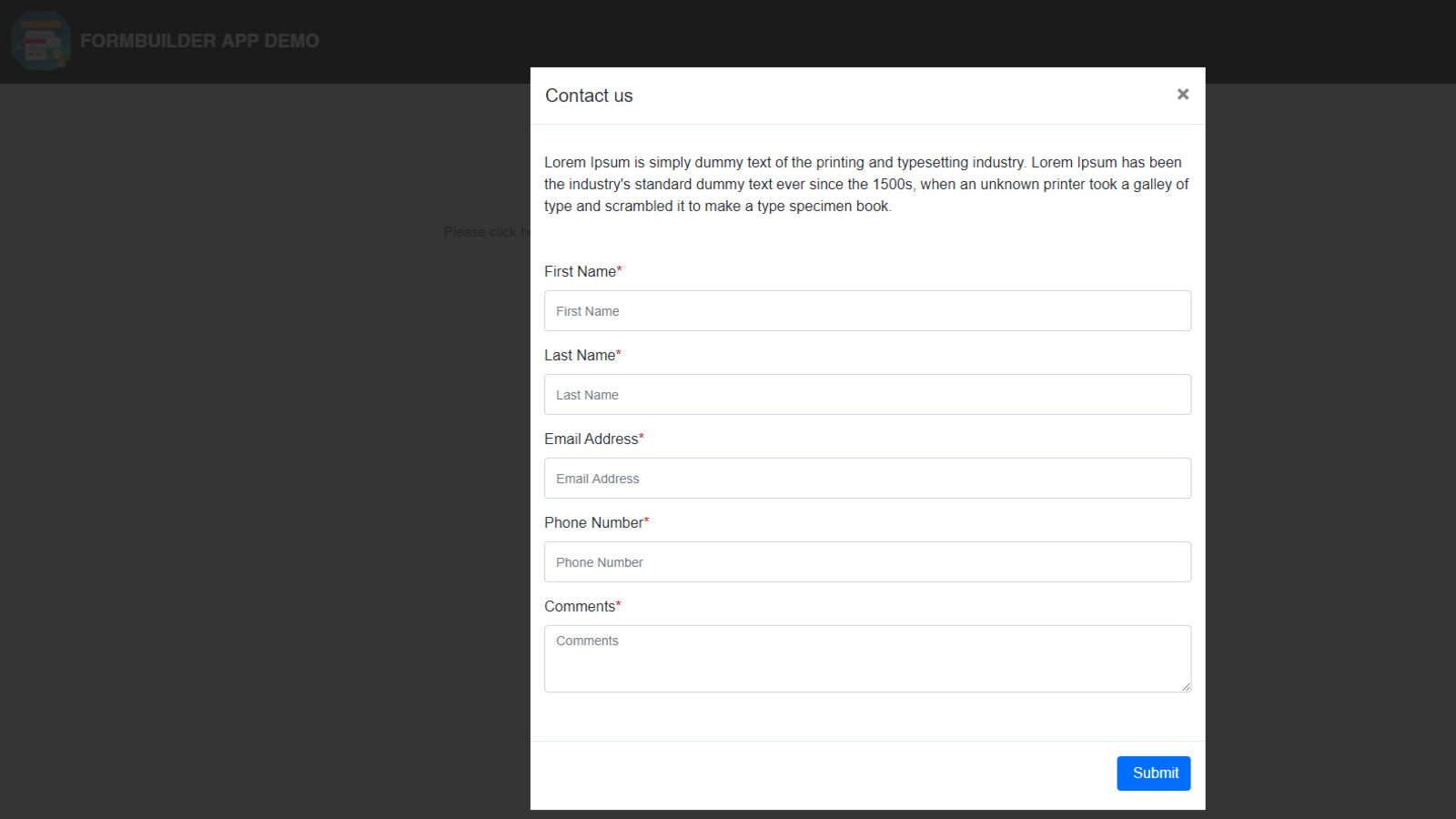 - The app supports all the major required form fields such as text fields, checkboxes, radios, dropdowns, dates, colors, and files (file upload).