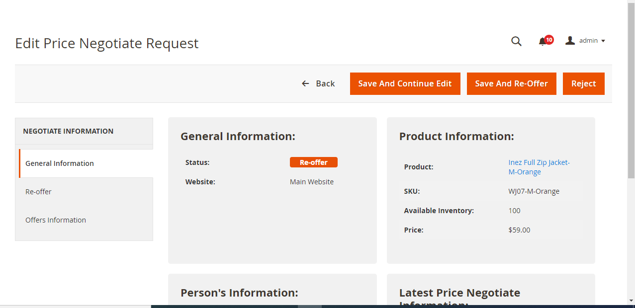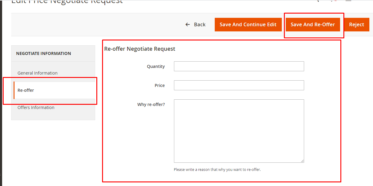 - The admin can adjust the status of “Price Negotiate” offers. Customers would find New, Accepted, Rejected, Re-offered, or Completed as the default status.