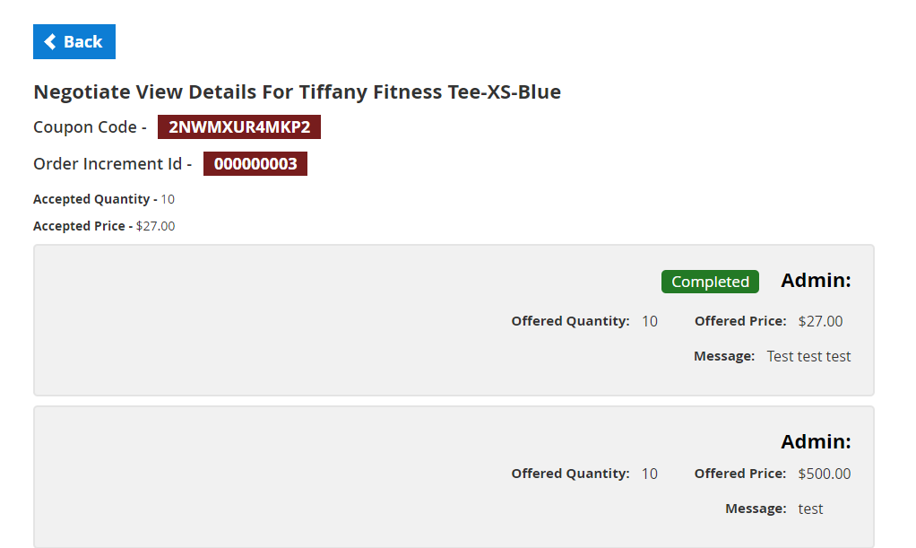 - Admin can accept, reject, and re-offer the request. Customers can accept or re-negotiate the offer. Accepted offers can be purchased from their customer account or through their mail.