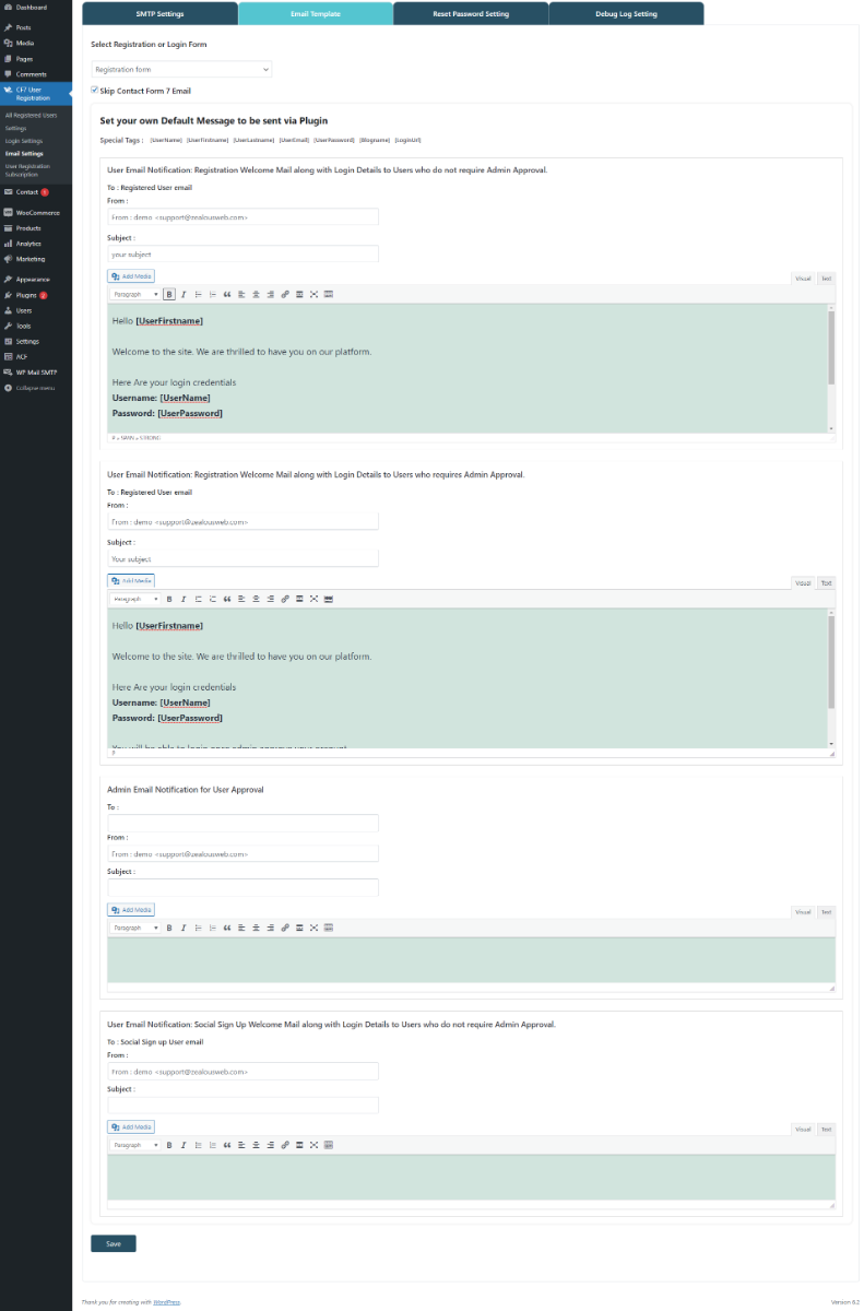 - Email Templates for Contact Form 7: Customize email templates for Contact Form 7 or bypass the default email notifications entirely. This allows you to send personalized registration and login email notifications.