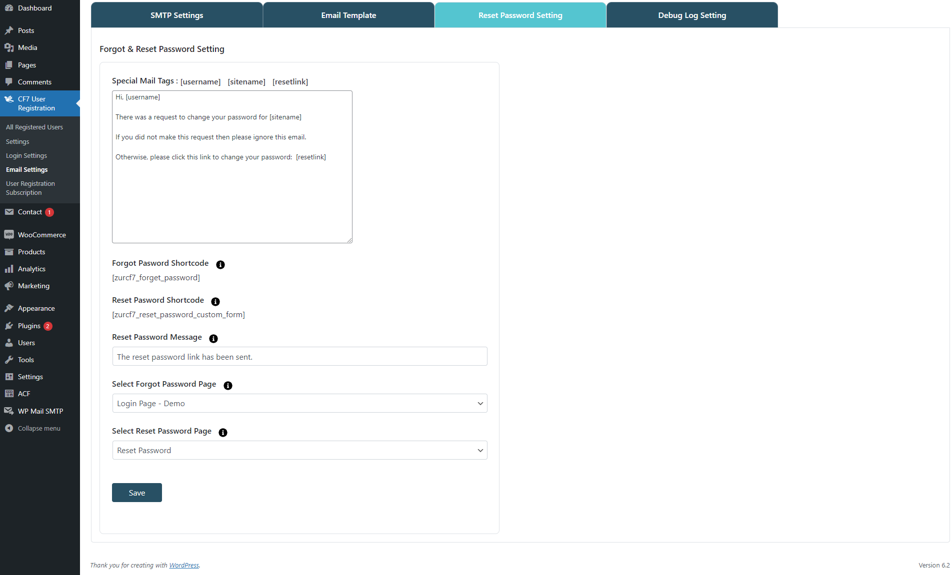 We offer custom validation messages shortcode and SMTP settings in our 'User Registration Using Contact Form 7 Pro' version, along with the added support for woocommerce. We offer 'forgot password' and 'reset password' features within the 'User Registration Using Contact Form 7 Pro' plugin making it a holistic plugin offering all elements of the User module.
